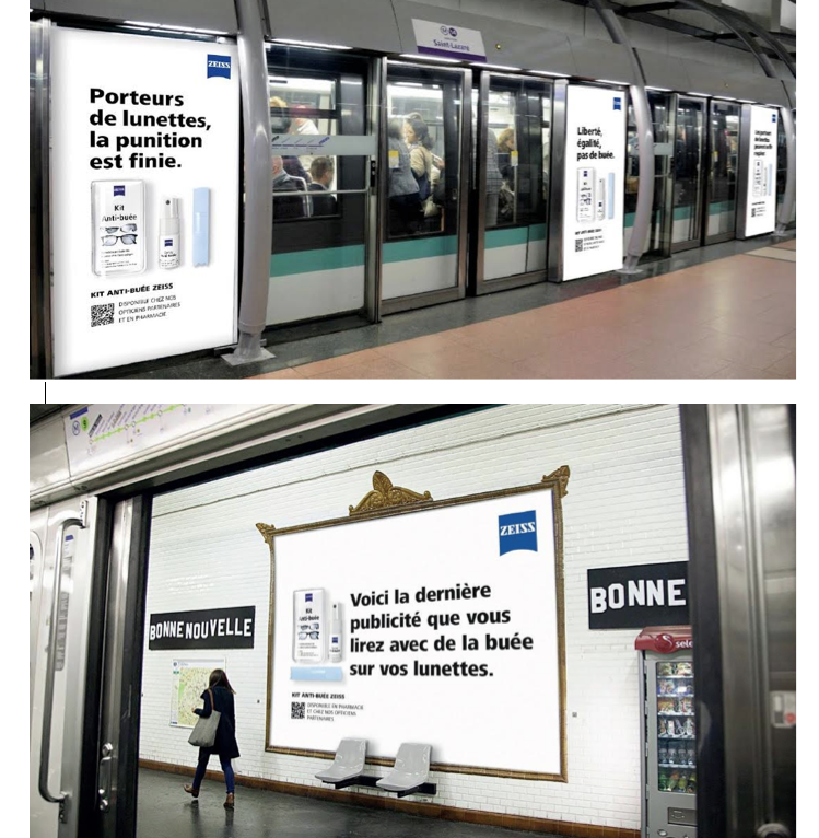 Depuis hier 1er novembre, le kit anti-buée Zeiss, qui s’est écoulé à 1,2 million d’exemplaires depuis son lancement il y a un an, arrive en gares, stations de métro et télévision. Une nouvelle campagne, basée sur une série de messages qualifiés d’« impactants et connivents » par le verrier, devrait générer plus de 400 millions de contacts en seulement un mois. Après une grande campagne de marque en télévision et radio en octobre, Zeiss accompagne le retour du froid et, donc, de la buée sur les lunettes en déployant un dispositif massif : la campagne centrée sur l’anti-buée sera visible dans 244 stations du métro francilien, 24 gares en France et fait l’objet d’une diffusion quotidienne sur France 2 à travers le parrainage de la météo précédant le JT de 20 h.