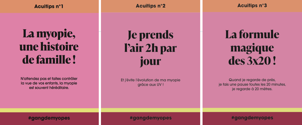 Depuis cet été, rappelons-le, Acuitis s’est positionné en tant qu’acteur engagé auprès de l’Institut d’éducation médicale et de prévention, qui entend impulser durablement plusieurs initiatives de sensibilisation du public sur le thème de la myopie. De son côté, en magasins, l’enseigne présente actuellement une campagne qui se veut à la fois ludique et pédagogique à travers ce qu’elle appelle des « Acuitips ». Il s’agit de dix messages de prévention à destination des parents et des enfants, qui prennent la forme d’un affichage et d’imprimés. L’opération a pour signe de ralliement le hastag #gangdemyopes... Par ce biais, l’enseigne informe donc le grand public et dispense des conseils pratiques facilement applicables au quotidien (prendre l’air, reposer régulièrement ses yeux éprouvés par les écrans, entre autres exemples.), pour limiter chez les jeunes le développement de la myopie. Acuitis offre aussi aux enfants des frisbees à l’image de la campagne dans le but de les inciter à jouer dehors, loin des écrans dont on sait qu’ils sont un facteur d’apparition ou d’évolution de la myopie chez les plus jeunes.