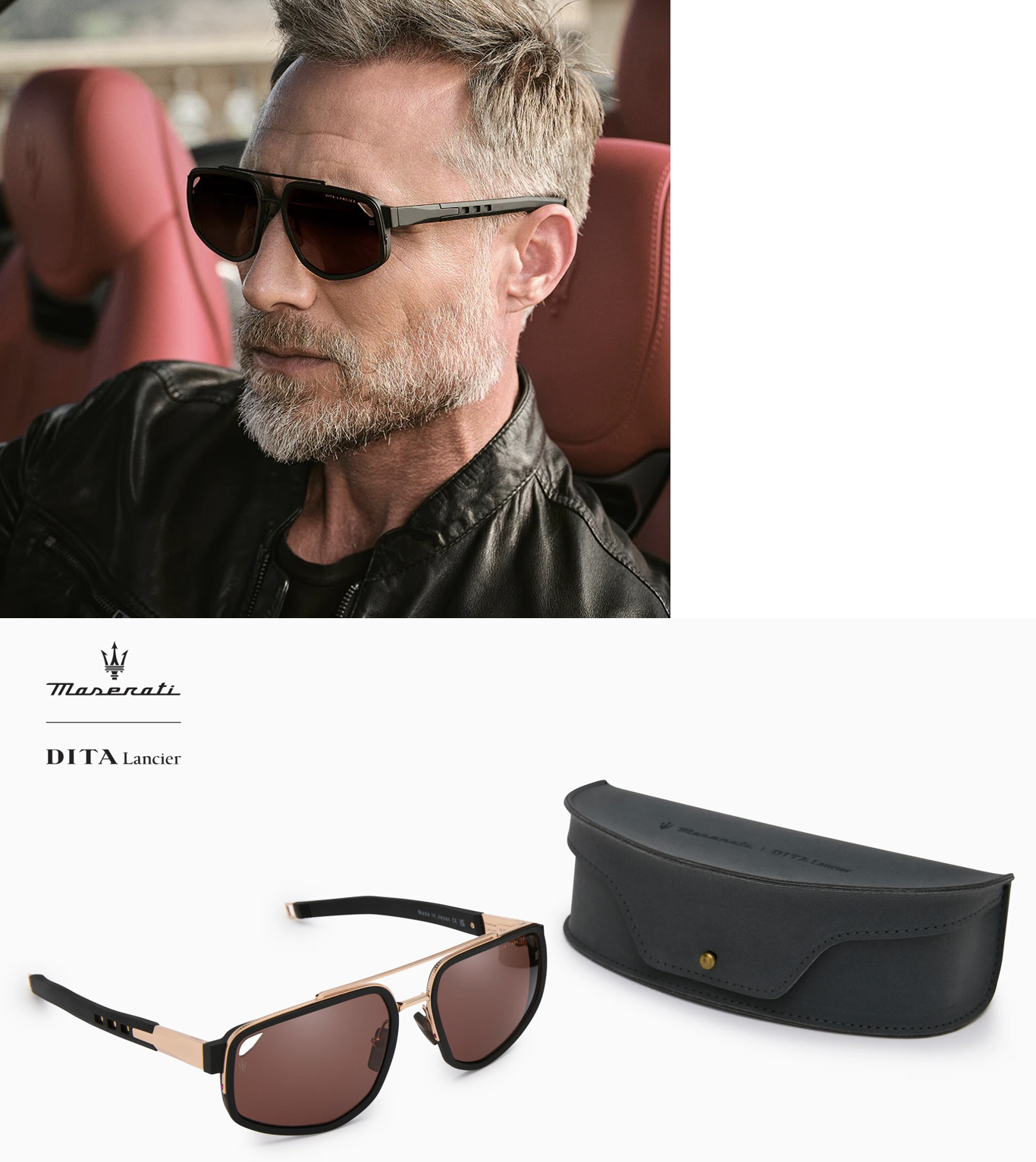 Les lunettes LSA-333 matérialisent la collaboration entre Dita Lancier (une collection haute de gamme à l’ADN technologique lancée par Dita en 2019) et Maserati. Fabriqué au Japon, ce modèle solaire au cadre en titane est équipé de verres en nylon TR90 intégrant un filtre polarisé pour une perception optimale des contrastes, notamment au volant. Sophistiqué mais pas ostentatoire, son design aérodynamique vient structurer le regard avec élégance et fait un évident clin d’oeil aux carrosseries racées du constructeur automobile italien. Ce concept se décline en trois coloris : or rose/noir mat avec verres polarisés marron, noir mat avec verres polarisés marron et reflets cuivrés ou encore argent antique brossé/bleu marine mat avec verres polarisés et reflets bleus.