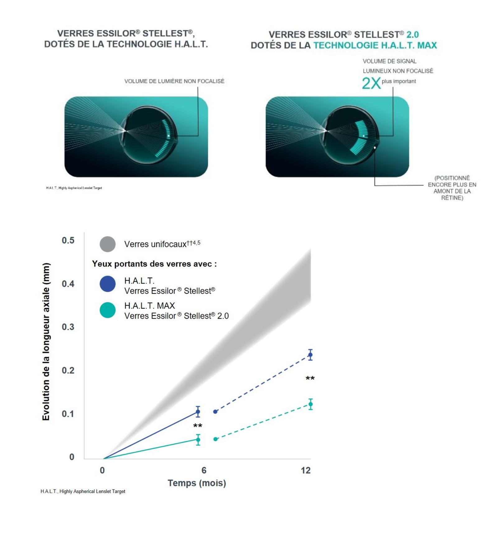 Cette efficacité renforcée de la deuxième génération des verres Stellest, un essai clinique randomisé, contrôlé, en double insu, controlatéral, croisé l’a confirmé récemment, à Singapour, auprès d’une cohorte de 50 enfants. « Les résultats ont montré que les verres Essilor Stellest 2.0, dotés de la technologie H.A.L.T. Max, ralentissaient de manière significative l’allongement axial de l’œil par rapport aux verres Essilor Stellest équipés de la technologie H.A.L.T. à 6 mois et 12 mois », résume le verrier qui a présenté ses résultats aux États-Unis, en mai dernier, lors du congrès de l'Association pour la Recherche dans la Vision et l'Ophtalmologie (Arvo). Pour ce qui est de la commercialisation du Stellest 2.0 en France, elle débutera le 6 janvier 2026.