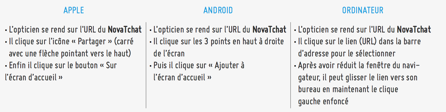 NovaTchat sera actif dès la semaine prochaine. De quoi s’agit-il précisément ? D’une messagerie instantanée à travers laquelle l’opticien partenaire de Novacel peut poser des questions sur le thème de son choix - technique, marketing, commercial. « Cependant, il n’aura pas la possibilité de passer une commande ou encore de demander des informations sur les prix », précise d’emblée la direction de l’entreprise. Le service NovaTchat fournit des réponses en temps réel (en moins de 2 min, assure le verrier), du lundi au vendredi de 10 h à 18 h. Concrètement, comment accéder à cette messagerie ? Il existe plusieurs façons de procéder : soit via un QR Code (l’opticien le scanne et rentre ses identifiants Novasoft2 sur la page de connexion), soit via un lien URL (l’opticien clique dessus et introduit ses identifiants), ou bien encore par le biais du site Novacel-optical.com, là encore avec ses identifiants personnels. (Et pour ceux qui ne possèderaient pas d’identifiants Novasoft2 ? Il leur suffit d’en faire la demande via cette adresse : Cette adresse e-mail est protégée contre les robots spammeurs. Vous devez activer le JavaScript pour la visualiser.). L’opticien peut également créer un raccourci du lien URL via son smartphone ou son ordinateur, comme l’indique la démarche à suivre ci-dessous. « Faciliter le quotidien de nos partenaires reste comme toujours l'une de nos priorités », commente Jenkiz Saillet, le directeur général de Novacel, à propos de ce nouveau service qui sera opérationnel à partir du 17 mai.